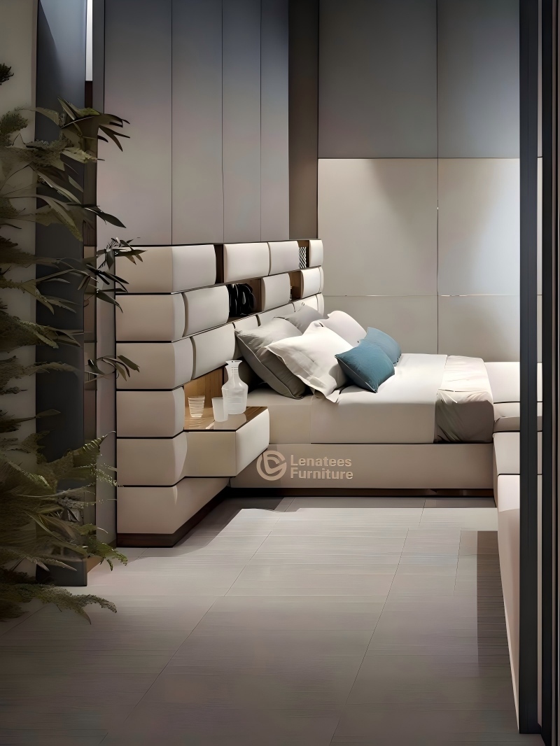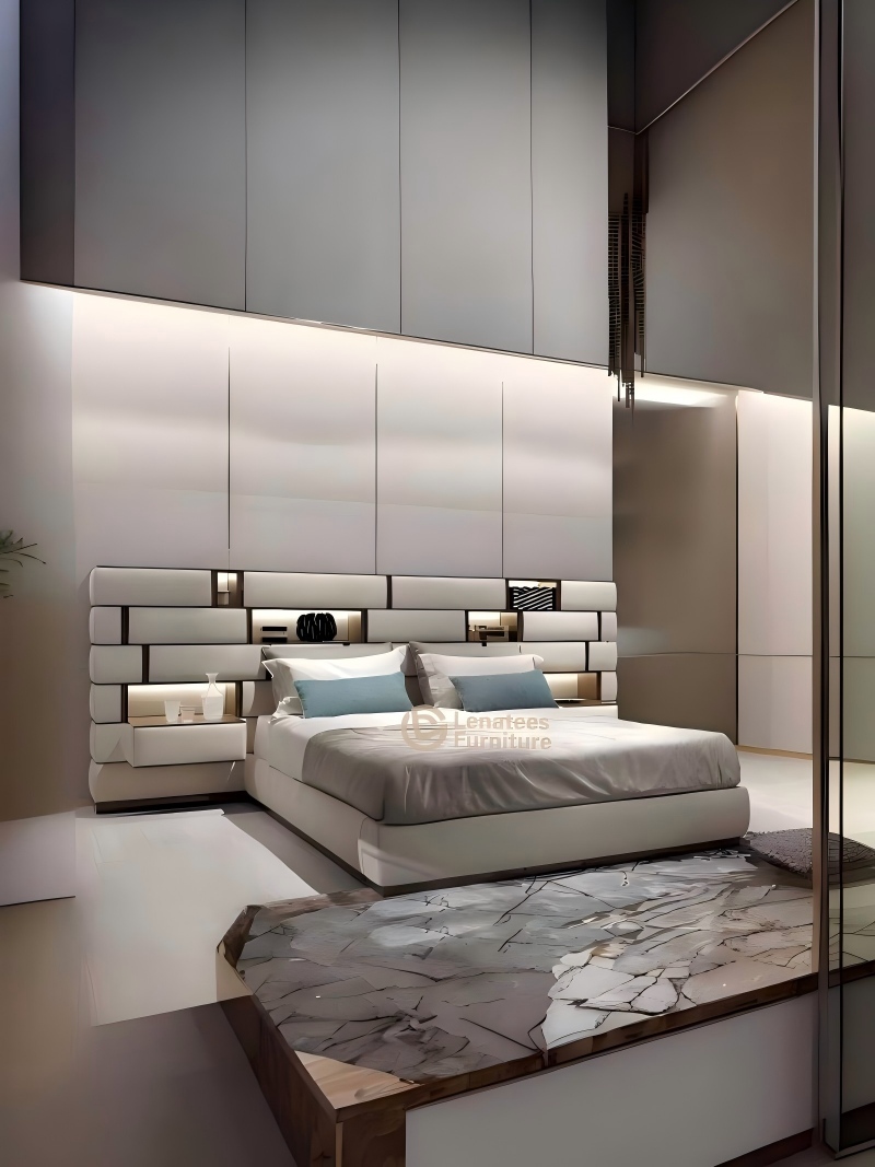 Ce lit de luxe est doté d'une tête de lit audacieuse avec des accents métalliques raffinés, alliant confort, savoir-faire et design contemporain.